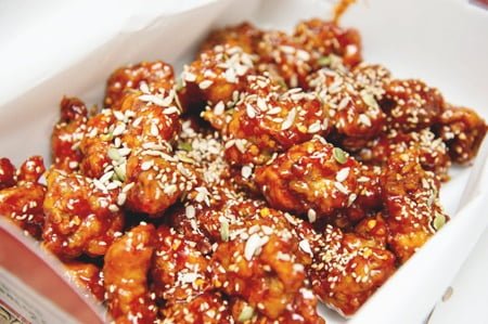 khácc với gà rán kiểu Mỹ được chiên giòn và chấm cùng tương cà hay tương ớt, gà rán kiểu Hàn Quốc thường được ăn kèm với các loại sốt mang đậm hương vị đặc trưng của xứ Kim Chi. Những miếng gà nhỏ, mềm, đẫm nước sốt cay hoặc sốt mật ong, vừng, tỏi, lạc và ớt bột sẽ khiến bạn mê mẩn ngay lần nếm thử đầu tiên.
