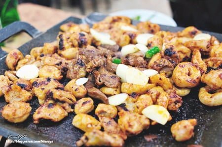 Lòng nướng, dạ dày nướng ở Hàn khácc với ở Việt Nam. Lòng giòn, dày miếng và thơm. Lòng bò hay lòng lợn nướng than, nướng phô mai, nướng hành mà uống với rượu soju sẽ đạt điểm 10 chất lượng. Bạn nên ăn ở gần trường Konkuk hoặc Wangsimni.