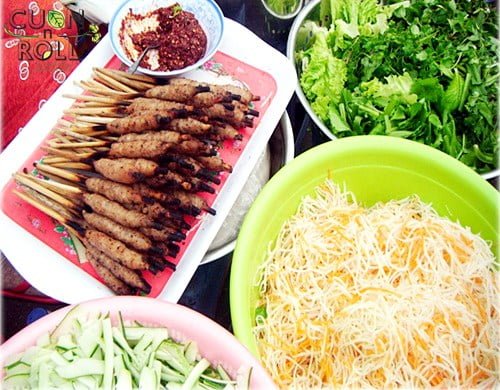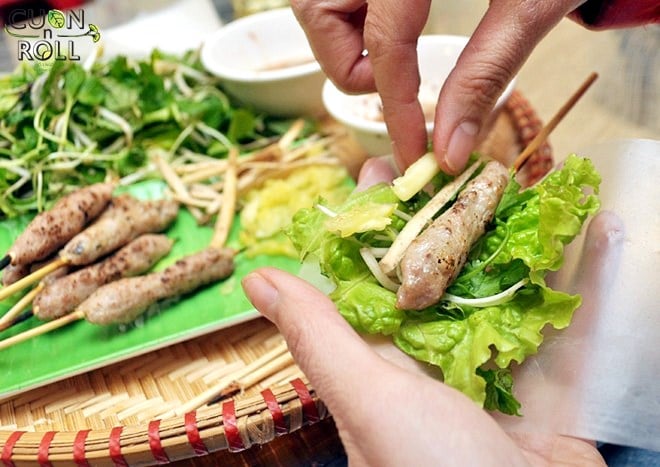 Đầu tiên chọn thịt heo ngon có pha nạc, mỡ và da, giã nhuyễn rồi ướp nước mắm, hành, tiêu…trong vòng 30 phút. Cuốn thịt vào từng chiếc đũa nhỏ hoặc thân cây sả rồi nướng chín trên than hồng. Khi nướng phải trở qua trở lại đều tay để nem chín đều, nem chín có màu vàng nâu hấp dẫn, hương thơm ngào ngạt.