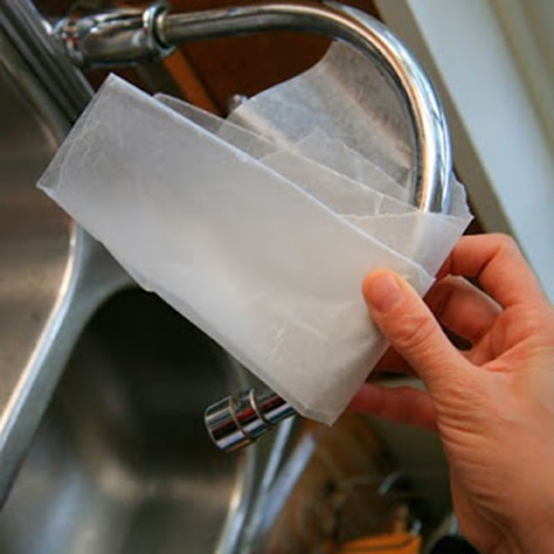 Chà vòi nước với một miếng giấy sáp để làm sạch các vết bẩn, cặn trên vòi nước.