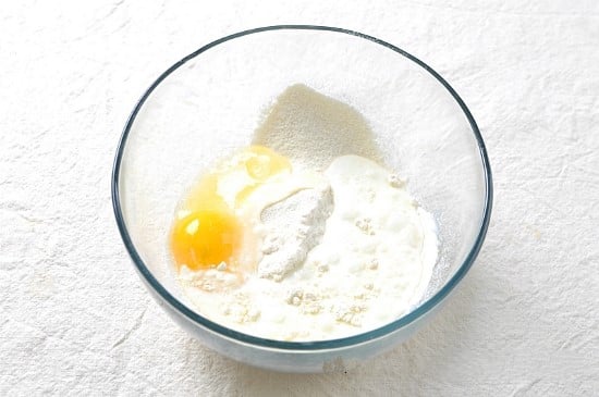 Đập 1 quả trứng vào tô bột, thêm sữa và một ít muối.