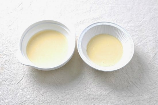 Làm tan chảy 2 thìa bơ rồi dùng cọ quét bơ vào đáy và thành hai chiếc bát. Tiếp đó cho phần bột đã trộn đổ đều vào 2 bát.