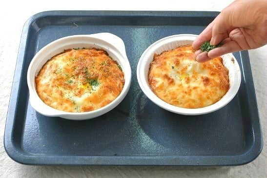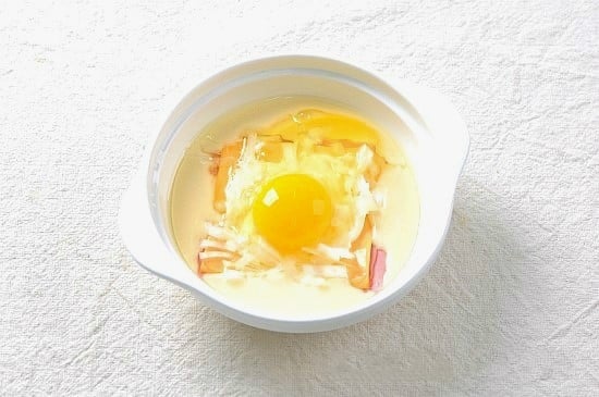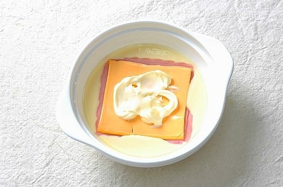 Mỗi bát bột đặt 2 lát thịt dăm bông vào, tiếp đó cho 1 lát phô mai cheddar lên trên. Tiếp đó cho 2 thìa sốt mayonnaise.