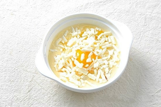 Cuối cũng bạn rắc phô mai mozzarella bào lên trên trứng.