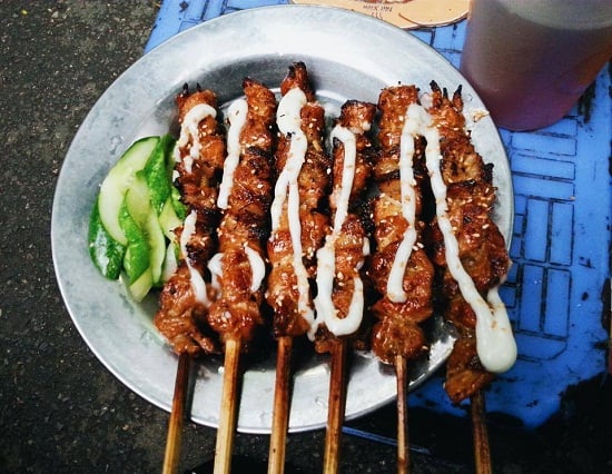 Cứ tầm 4, 5h chiều mà dạo dạo khắp các kí túc xá hay hàng quán ở trường học thì đúng là sẽ bị mùi thịt xiên nướng… bám riết không thôi. Thịt cả nạc lẫn mỡ, tẩm ướp kỹ càng, được nướng hơi sém siêu thơm. Ở một số nơi sẽ có nước sốt riêng, một vài nơi chỉ dùng tương ớt, tương cà nhưng độ hấp dẫn thì như nhau cả! Ngon và dễ ăn. Đi cùng thịt xiên nướng sẽ là xúc xích, lạp xưởng nướng và bánh mỳ ăn kèm.