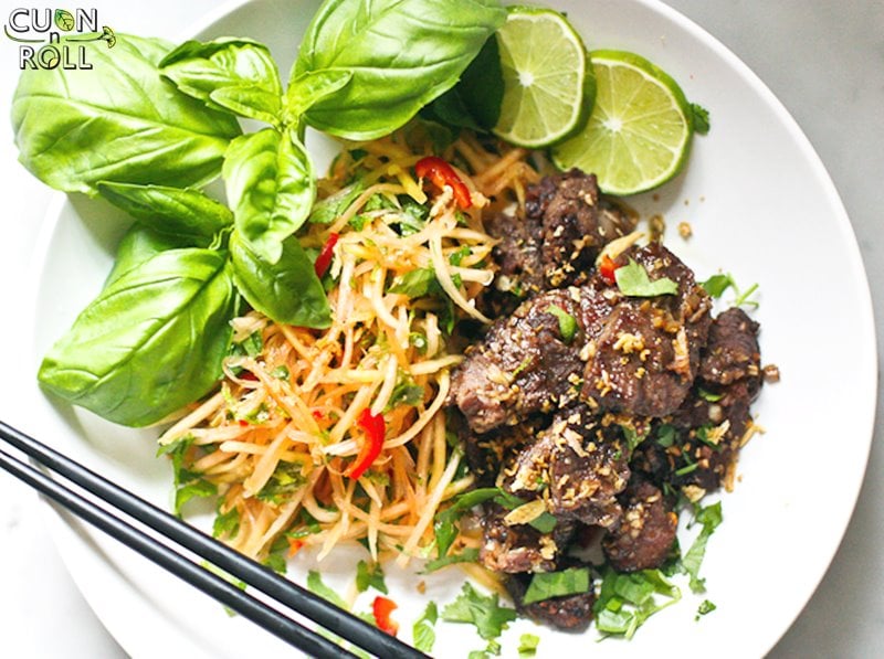 | 450g thịt bò thăn 500-700g đu đủ non 230g lá bạc hà, rau mùi và húng quế băm nhỏ 30g đậu phộng nghiền 15g hành phi giã nhỏ Nước chấm: 30ml nước cốt chanh 20ml dầu olive 20g đường 10ml nước mắm 10g ớt băm Một ít tỏi băm | Gia vị ướp: 60g sả 5ml nước mắm 10g dầu mè 15ml dầu hào 30g đường Một ít tiêu xay, ớt bột, bột ngũ vị |
