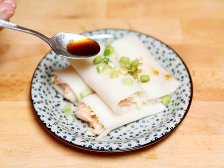 – Bước 5: Đặt bánh cuốn lên xửng hấp thêm lần nữa trong khoảng 2 phút để tôm chín thì gắp ra. Rắc lên hành lá cắt nhỏ và rưới đều nước xốt.