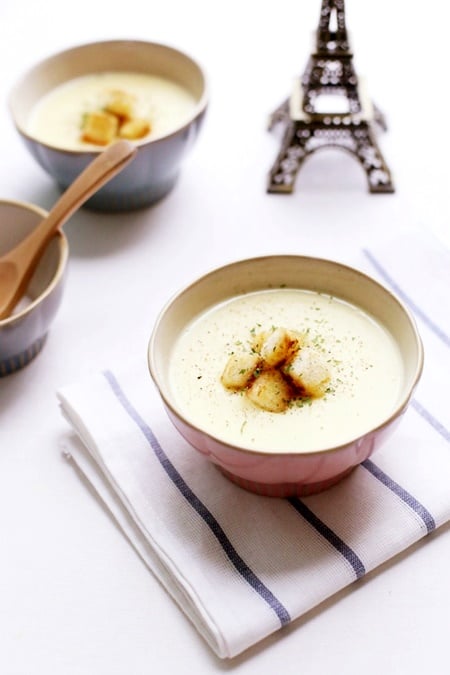 – Bước 4: Lấy súp khoai lang phô mai ra bát, rắc chút bột ràu mùi tây lên trên và ăn kèm với bánh mì nướng giòn.