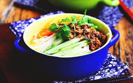 Bước 5: Cho mỳ ra tô, trình bày cùng dưa leo, cà rốt và nấm. Cho thịt bằm lên trên phần mỳ, có thể trang trí cùng hành ngò nếu muốn. Khi ăn các bạn nhớ trộn đều lên nhé!