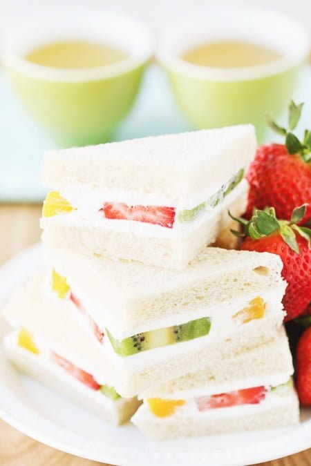 Bước 3: Thoa kem đã đánh bông lên cả hai mặt bánh mì và rải trái cây lên mặt.