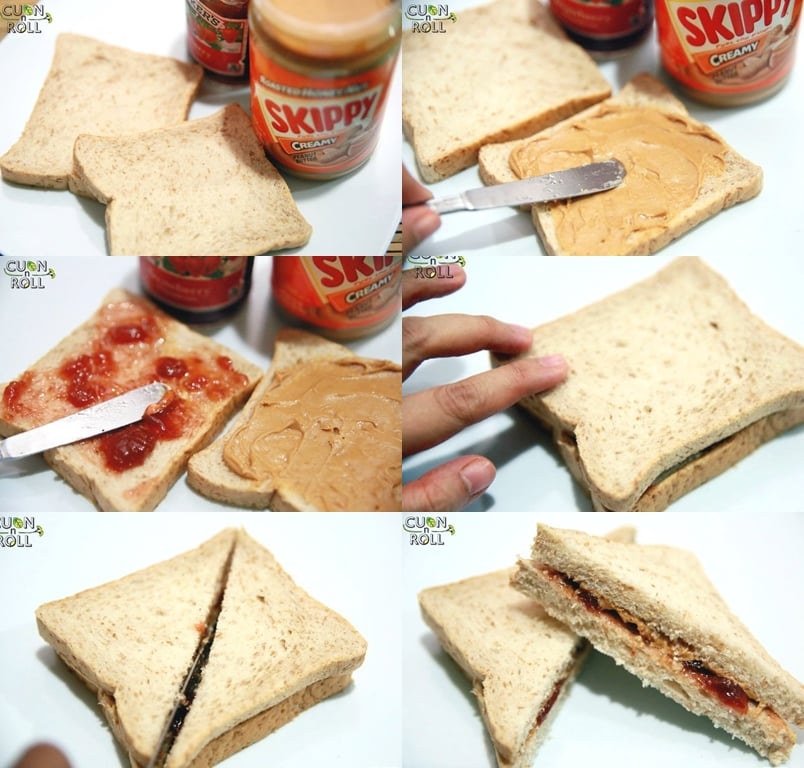 – Phết bơ đậu phộng lên một mặt của 2 lát bánh mì
