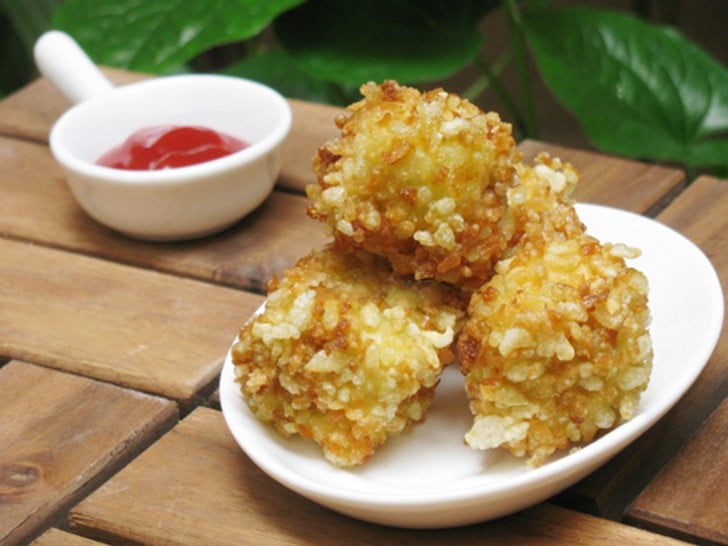 – Xếp rau xà lách ra đĩa, cho đậu phụ cốm lên trên. Món này có thể ăn kèm với sốt mayonnaise trộn tương ớt. Nếu bạn ăn cay thì thêm ít ớt cắt nhỏ vào.
