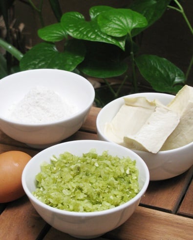 2 bìa đậu phụ non + 300g cốm + 100g bột chiên giòn + xà lách + và các gia vị thường dùng.