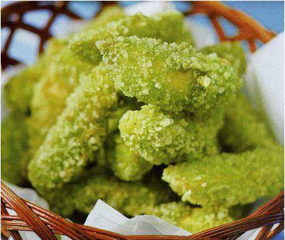 2. Bột rán giòn hòa với chút nước cho sền sệt. Nhúng khoai tâyvào bột rán giòn, lăn qua cốm, thả vào chảo dầu nóng rán vàng, vớt ra để ráo dầu. Dọn ra rổ có lót giấy thấm dầu, dùng kèm với tương ớt.