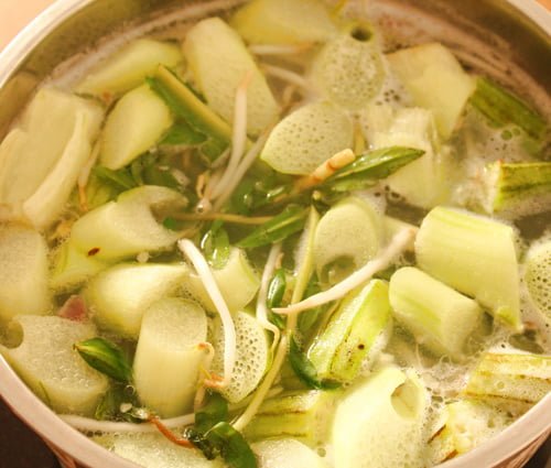 Bước 4: Đổ 1.2 lít nước cùng me ngào, đậu bắp, bạc hà, ngổ, ngò gai, giá vào nấu khoảng 10 phút.