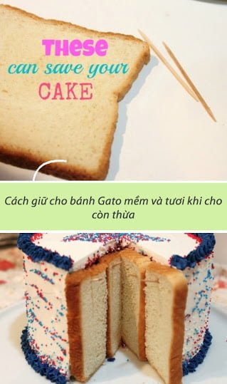 Thông thường với bánh ngọt, gato mà chúng ta không sử dụng hết và đem cất đi để ăn sau đó thì bên trong bánh và phần bị cắt thường không đồng đều, phần bánh bị cắt thường hay bị khô và mất ngon. Để xử lý chúng, hãy ghim lên phần bề mặt bị cắt những miếng bánh mì để che đi, chúng sẽ giúp bánh không bị khô ở bên ngoài và vẫn giữ được độ mềm, ngon của bánh.