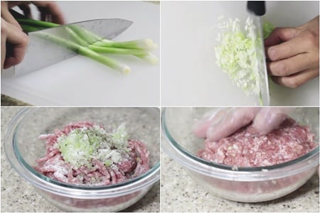 – Thịt nạc rửa sạch, bằm nhuyễn, ướp một ít tiêu, đường, bột ngọt, muối, trộn đều rồi để gia vị thấm khoảng 15 phút. Nếu bạn chuẩn bị nấm rơm và trứng gà thì trộn thêm nấm rơm và lòng trắng trứng vào hỗn hợp để phần nhân thịt thêm đậm đà.
