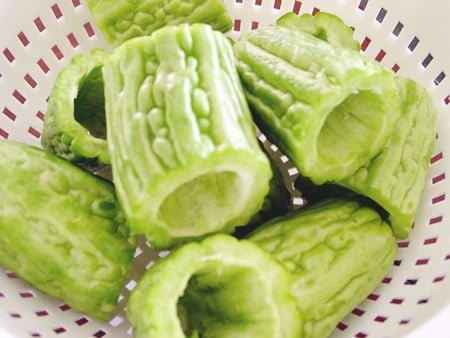 – Khổ qua cắt khúc thành 2 (Nếu trái to thì cắt thành 3 hoặc 4 khúc), dùng muỗng nhỏ khoét sạch ruột, rửa sạch, để ráo nước. Lưu ý: Nếu bạn không thích vị đắng của khổ qua thì có thể chần qua nước sôi, thì khi nấu canh sẽ ít đắng hơn.