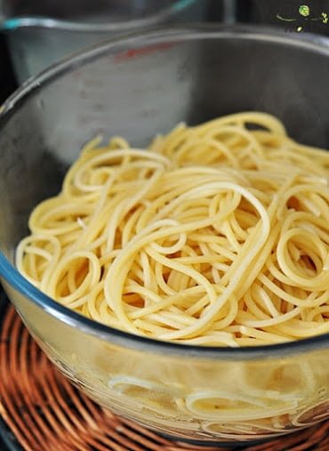 Luộc khoảng 5’, mì chín thì vớt ra rổ và tráng qua nước lạnh và trộn một chút dầu ăn vào để cho sợi mì không bị dính.