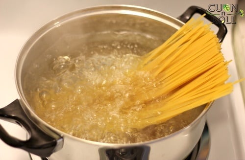 Luộc mì: Đun nước sôi cho lượng mì bạn định nấu vào luộc. Mì sẽ nở nên nhớ luộc nhiều nước một chút nhé cả nhà. Khi luộc cho thêm chút muối tinh vào để cho mì đậm vị hơn.