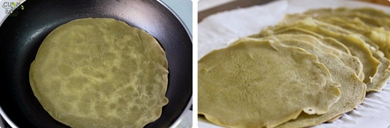 - Đặt 1 cái chảo chống dính đường kính 6 inch lên bếp, phết bơ lên khắp mặt chảo. Đổ 2-3 tbsp bột bánh lên, láng mỏng. Chiên đến khi 2 mặt chín vàng thì úp ra đĩa. Làm tiếp đến khi hết bột.