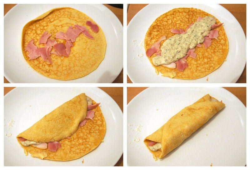 Các bạn có thể dùng bánh Crepe với bất cứ nguyên liệu yêu thích nào, từ hoa quả, mứt hoa quả, kem tươi, chocolate, hay dăm bông, thịt nguội… Các bạn chỉ việc gập bánh Crepe lại, trang trí theo ý thích hoặc cho nguyên liệu ăn kèm như dăm bông, măng tây vào rồi cuốn lại, là xong. Cực dễ phải không nào.
