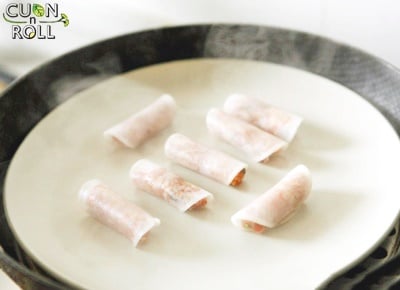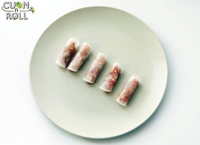 Bước 6: – Cho thịt vào miếng củ cải rồi cuộn lại, độ ẩm trong thịt sẽ cố định miếng cải. Sau đó, mình đặt các cuốn vừa làm lên đĩa.