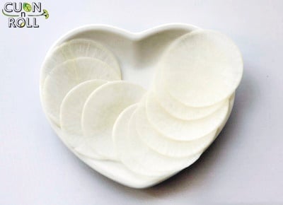 Bước 4: – Bào bỏ vỏ củ cải, rửa sạch rồi cắt thành từng lát thật mỏng.