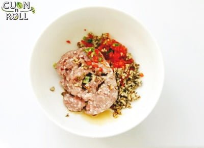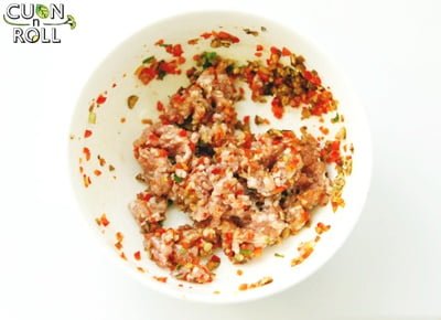 Bước 2: – Cho nấm, hành lá, và ớt xắt nhỏ vào phần thịt xay rồi trộn đều.