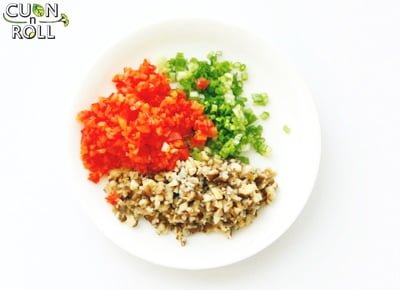 Bước 1: – Rửa sạch ớt, nấm và hành lá, sau đó băm nhỏ.