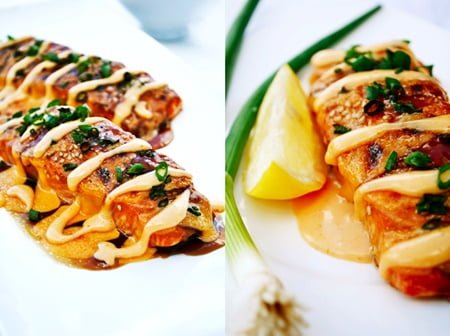 | – 15g bột ng – 60ml nước tương – 60g đường nâu – Một ít gừng xay, bột tỏi – 30ml mật ong | – 2 lát phi lê cá hồi – 120ml xốt mayonnaise – 30-45ml tương ớt – 15-20ml sữa đặc |