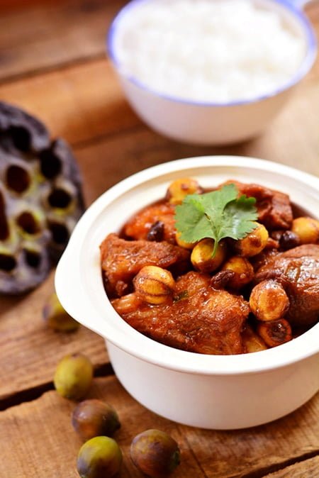 – Bước 2: Phi thơm hành khô và cho thịt lợn vào đảo nhanh tay. Khi miếng thịt săn lại, cho hạt sen vào đảo chung. Nêm gia vị với 1 muỗng canh xì dầu.
