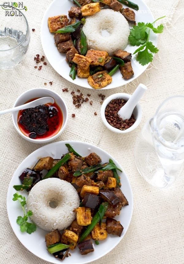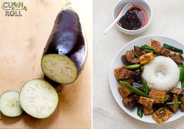 – Đợi thịt heo gần chín, cho cà tím, đậu hũ, sốt tứ xuyên vào. Nấu lửa riu riu cho sốt thấm vào cà và đậu hũ.