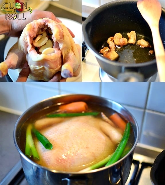 Đun sôi một nồi nước lớn. Nêm vào khoảng 2 muỗng muối. Thả nguyên con gà vào nồi nước và luộc trong vòng khoảng 30 phút. Nếu gà không ngập trong nước khi luộc, bạn hãy trở gà để gà được chín đều nhé.