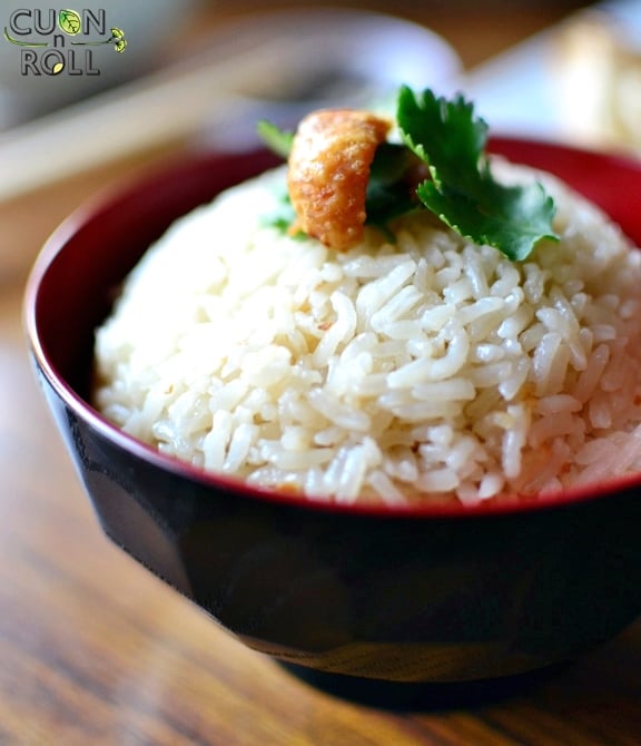 Đổ phần gạo đã để ráo vào xào chung với tỏi và mỡ trong khoảng 5 phút cho gạo hơi trong lại rồi vớt phần mỡ gà trên mặt nước luộc gà và cho vào nồi cơm.