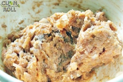 – Trộn tôm, thịt nạc xay, hành khô thái nhỏ, một ít hạt tiêu, bột năng, một thìa canh dầu ăn, hai thìa nhỏ muối, một thìa nhỏ đường, trộn đều, dùng thìa quết nhuyễn. Ướp khoảng 30 phút.