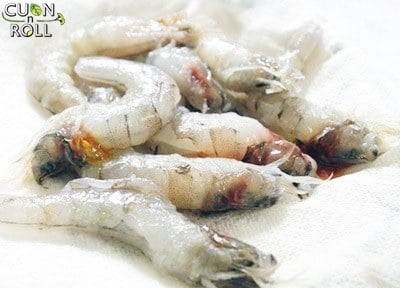 – Tôm rửa sạch với nước muối pha loãng, bóc bỏ nõn, rút chỉ đen, dùng giấy sạch lau tôm thật khô, giữ lại đầu gạch tôm.