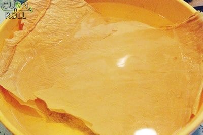 – Phù trúc ngâm vào nước lạnh cho mềm, ngâm khoảng 5 phút, vớt ra rổ để cho ráo nước. Nếu lá phù trúc dài thì bạn cắt nhỏ để dễ gói.
