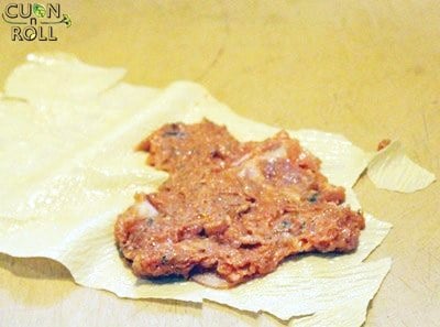 – Dùng thìa múc một ít hỗn hợp tôm thịt để lên bề mặt miếng phù trúc.