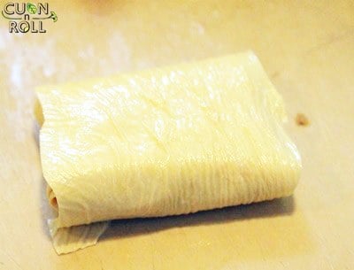 – Xếp miếng phù trúc thành hình nhữ nhật hay hình tròn tùy theo sở thích của bạn, dùng lòng đỏ trứng gà để dán mép lại cho kín.