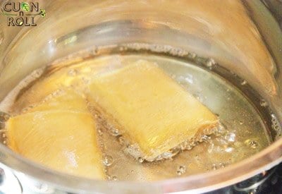 – Đun nóng nồi nhỏ, đổ dầu vào, đợi dầu nóng thả từng miếng phù trúc vào chiên đến khi vàng đều hai mặt.