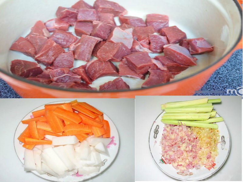 – Đối với Thịt bò bạn hãy lọc hết mỡ, và sau đó cắt miếng vuông, ướp thịt với các nguyên liệu sau: