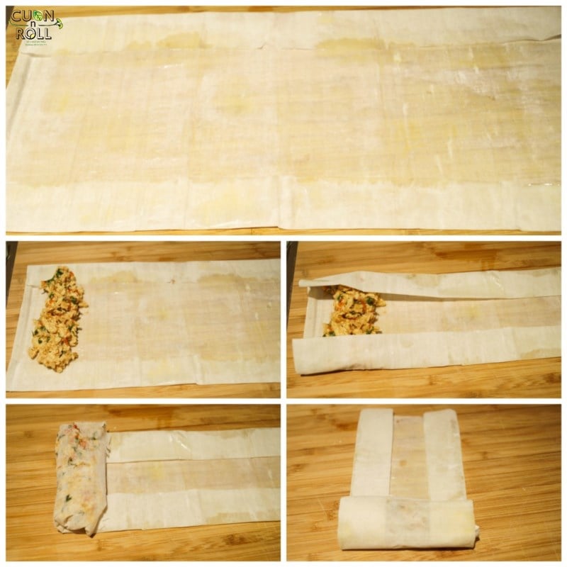– Các bạn trải bánh tráng ra, cho nhân thịt gà vào, cuộn chặt tay để nem được đều và đẹp.