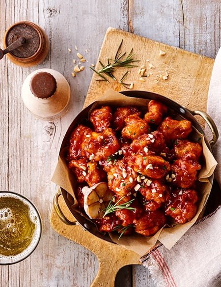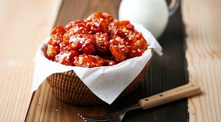 | 1kg gà 500ml sữa tươi 3 muỗng canh đậu phộng giã nhuyễn 70g bột gạo tẻ 70g tinh bột khoai tây – Hỗn hợp gia vị: ½ muỗng cafe bột nở 1 muỗng cafe muối ½ muỗng cafe tiêu đen 1 muỗng canh rượu gạo 2 tép tỏi băm | – Hỗn hợp nước sốt: 6 muỗng canh ớt Gochujang ¼ chén đường nâu 6 muỗng canh tương cà 2 muỗng canh rượu gạo 6 muỗng canh mật ong 2 muỗng canh hành tây băm nhỏ 1 muỗng cafe tỏi băm 1 muỗng canh dầu ăn 1 muỗng cafe nước tương |