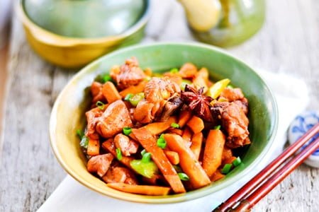 – Bước 2: Làm nóng chảo với chút dầu láng mặt, cho ớt khô, hoa hồi và gừng bằm vào đảo thơm, sau đó trút thịt gà vào đảo nhanh tay cho đến khi thịt gà săn lại. Thêm 1 muỗng canh xì dầu rồi đảo đều.