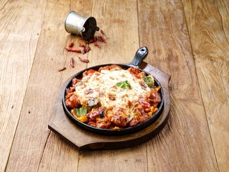 – Bước 4: Rắc phô mai lên trên mặt chảo thịt gà, đậy vung lại. Đợi cho phần phô mai chảy ra hoàn toàn là có thể dùng được.