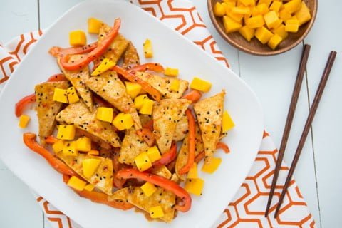 -Tiếp tục cho đậu hũ vào xốc trên lửa lớn cho hỗn hợp hòa quyện. Tắt bếp, bày đậu hũ chiên xốt xoài ra đĩa, rắc mè rang lên dùng nóng với nước tương.