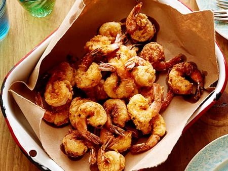 – Bước 6: Đun nóng chảo với lượng dầu ngập mặt, chờ dầu sôi thì thả tôm vào chiên. Chiên cho đến khi tôm vàng giòn cả hai mặt thì vớt ra đĩa có lót sẵn giấy thấm dầu cho ráo bớt dầu thừa.