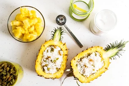 – Bước 4: Nhồi gạo đã trộn vào vỏ quả dứa, sau đó cho vào nồi hấp, hấp xôi trên lửa vừa trong khoảng 30 phút thì bạn kiểm tra nồi hấp rồi dùng muỗng đảo đều xôi. Đặt một lớp thịt dứa lên trên xôi và hấp thêm khoảng 30 phút nữa ở lửa vừa hoặc thấp là được.