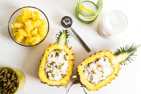 – Bước 2: Bổ đôi quả dứa theo chiều dọc, dùng dao cắt vào thịt dứa thành các ô vuông, sau đó dùng muỗng múc thịt dứa ra bát, bạn múc thịt dứa sao cho vỏ dứa còn lại dày khoảng 1,5cm và tạo thành hình dạng một cái bát. Tiếp đó trút dứa vừa múc vào một cái rây, bóp qua để tách nước dứa ra.